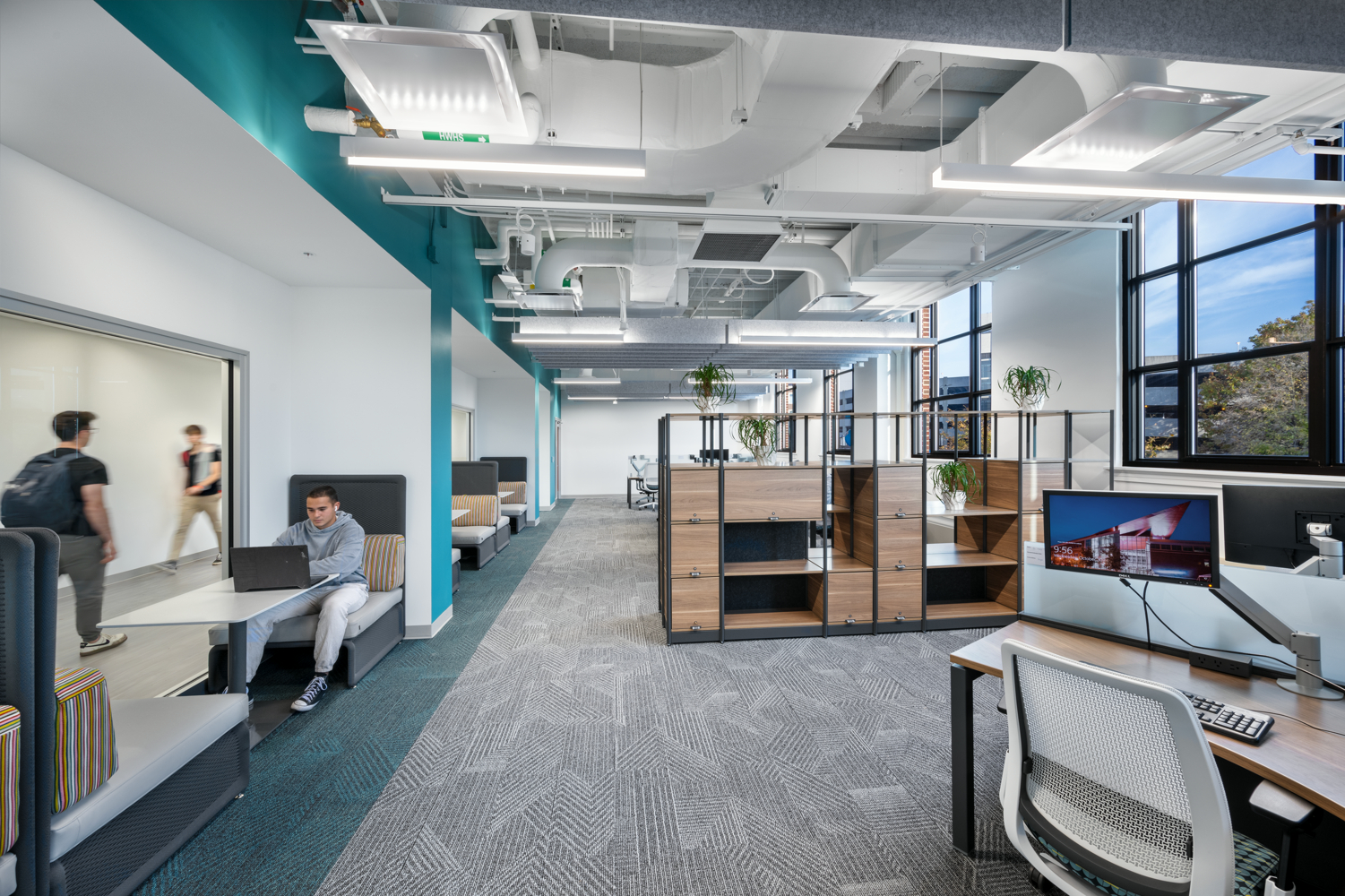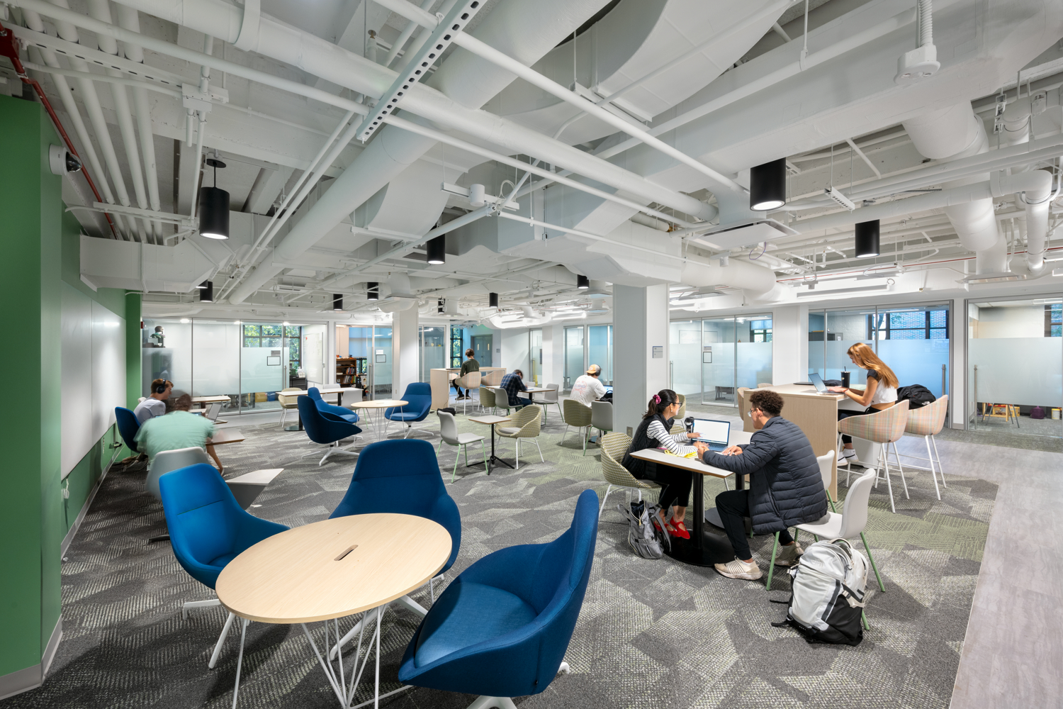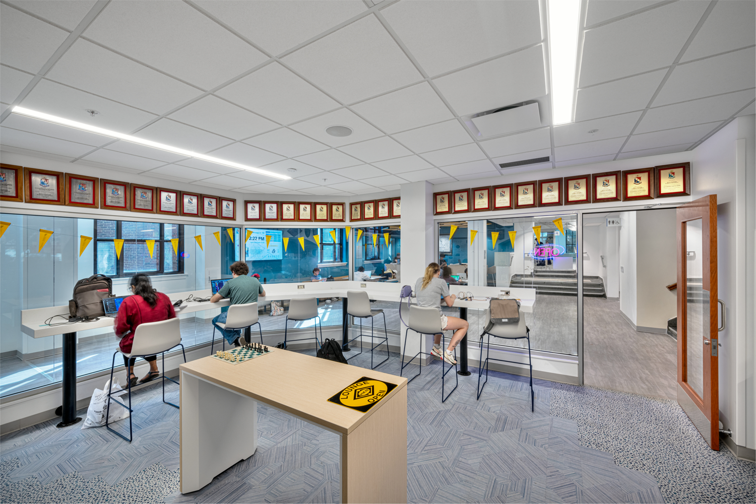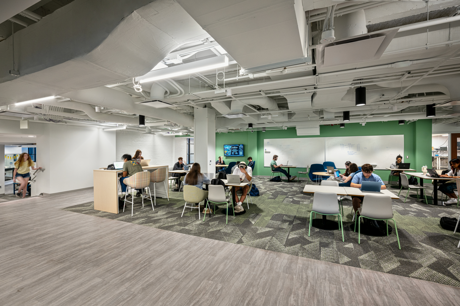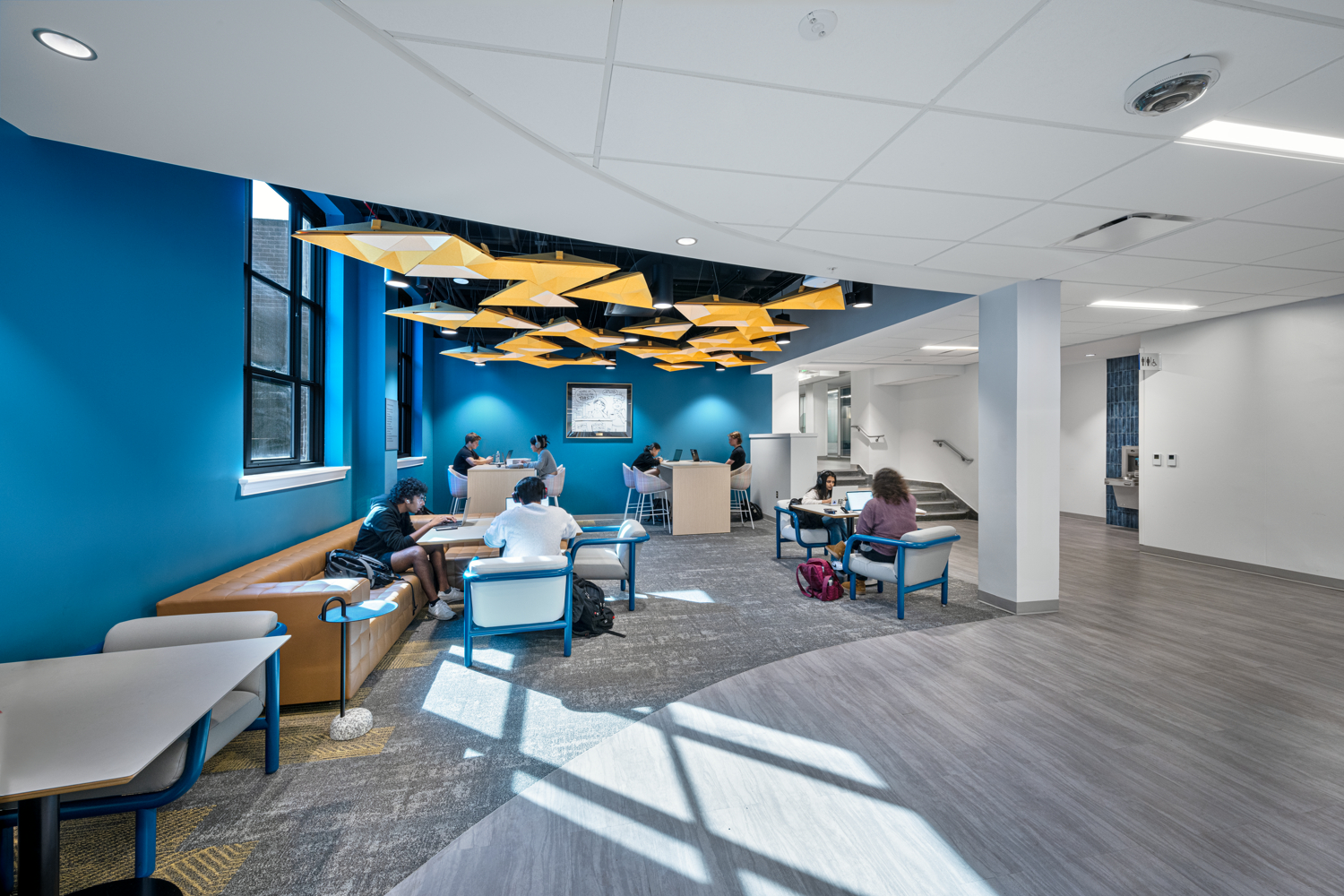 Equally important to the project was creating spaces that foster connection. New collaborative and social zones encourage student‑to‑student and student‑to‑faculty interaction, reinforcing a sense of academic community within the historic facility. Accessibility improvements further support inclusive use of the building across programs and users.