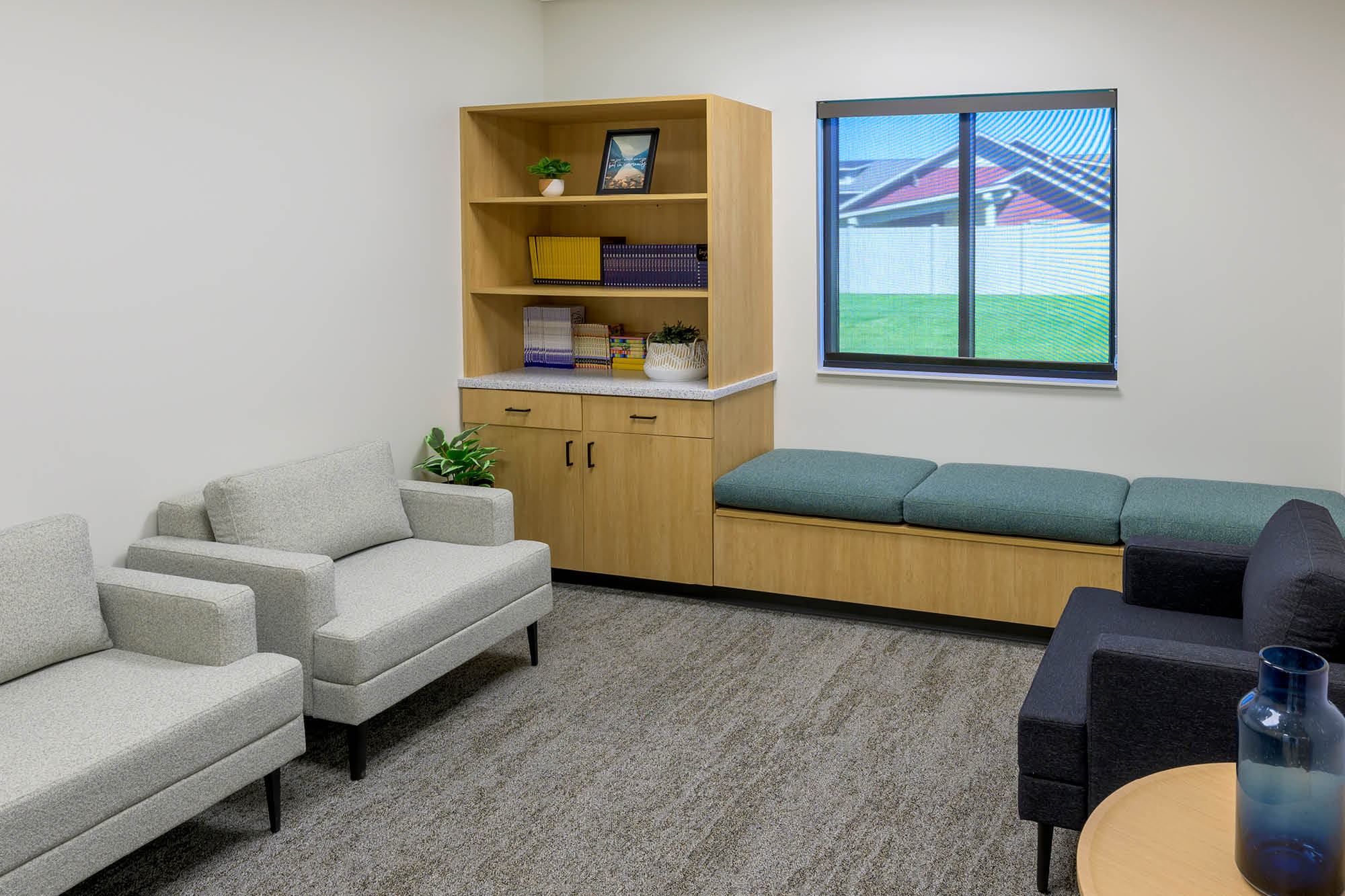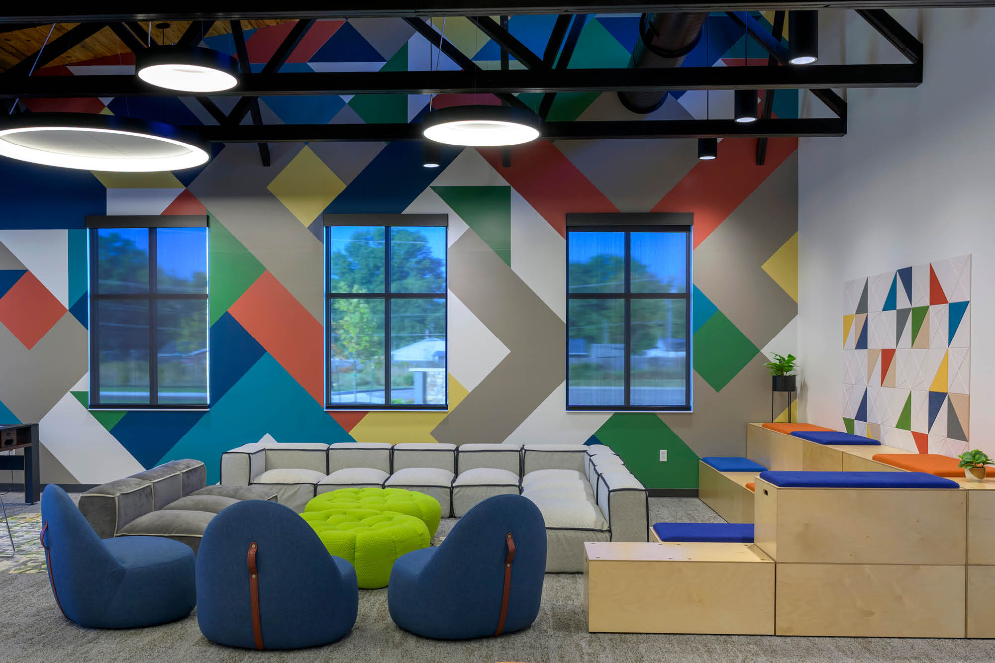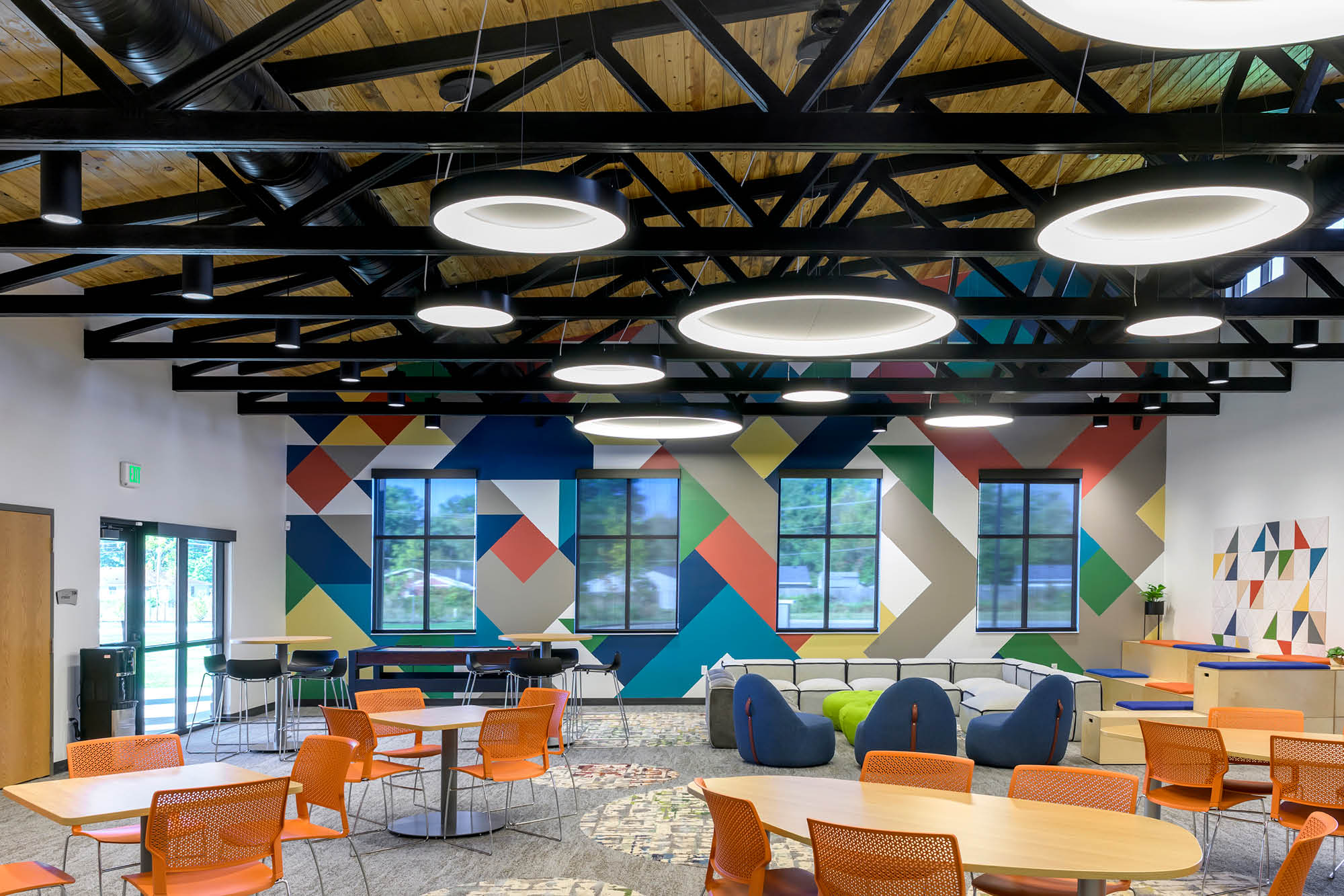 The Wing now provides a purpose-built sanctuary where older grieving youth find solace and connection. Uplifting colors, bright patterns and inviting motifs evoke hope while maintaining a cozy, coffee shop-like atmosphere. Clerestory windows emphasize dramatic ceilings and acoustic fixtures, while biophilic textures create sensory comfort. Modern black and bronze trims with bold geometric murals provide visual interest that connects with this age group.
