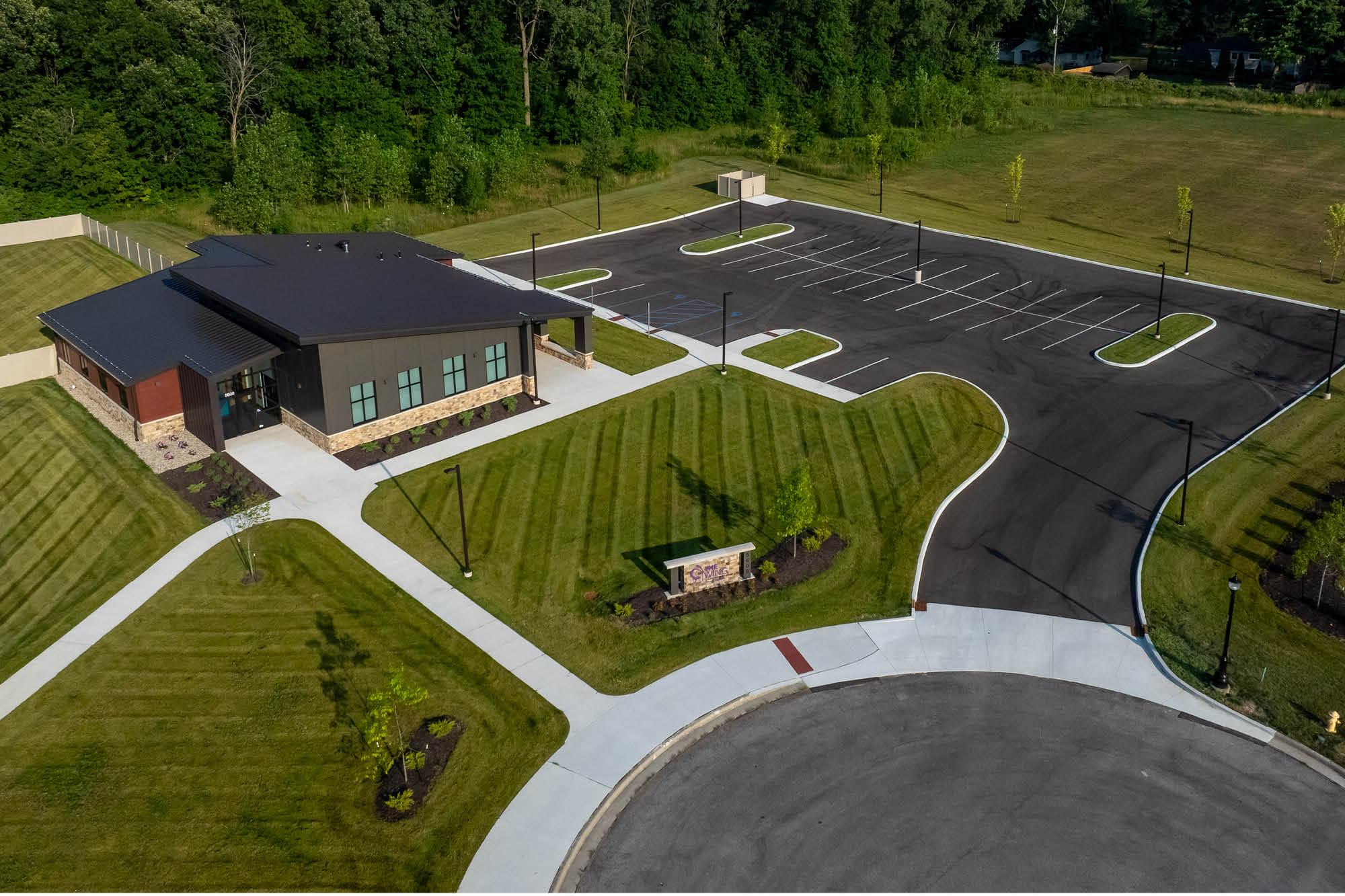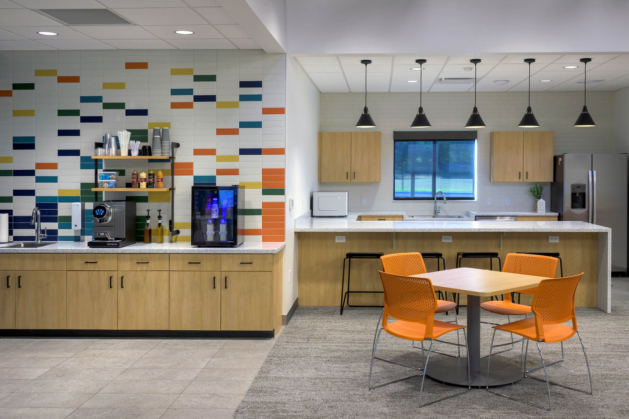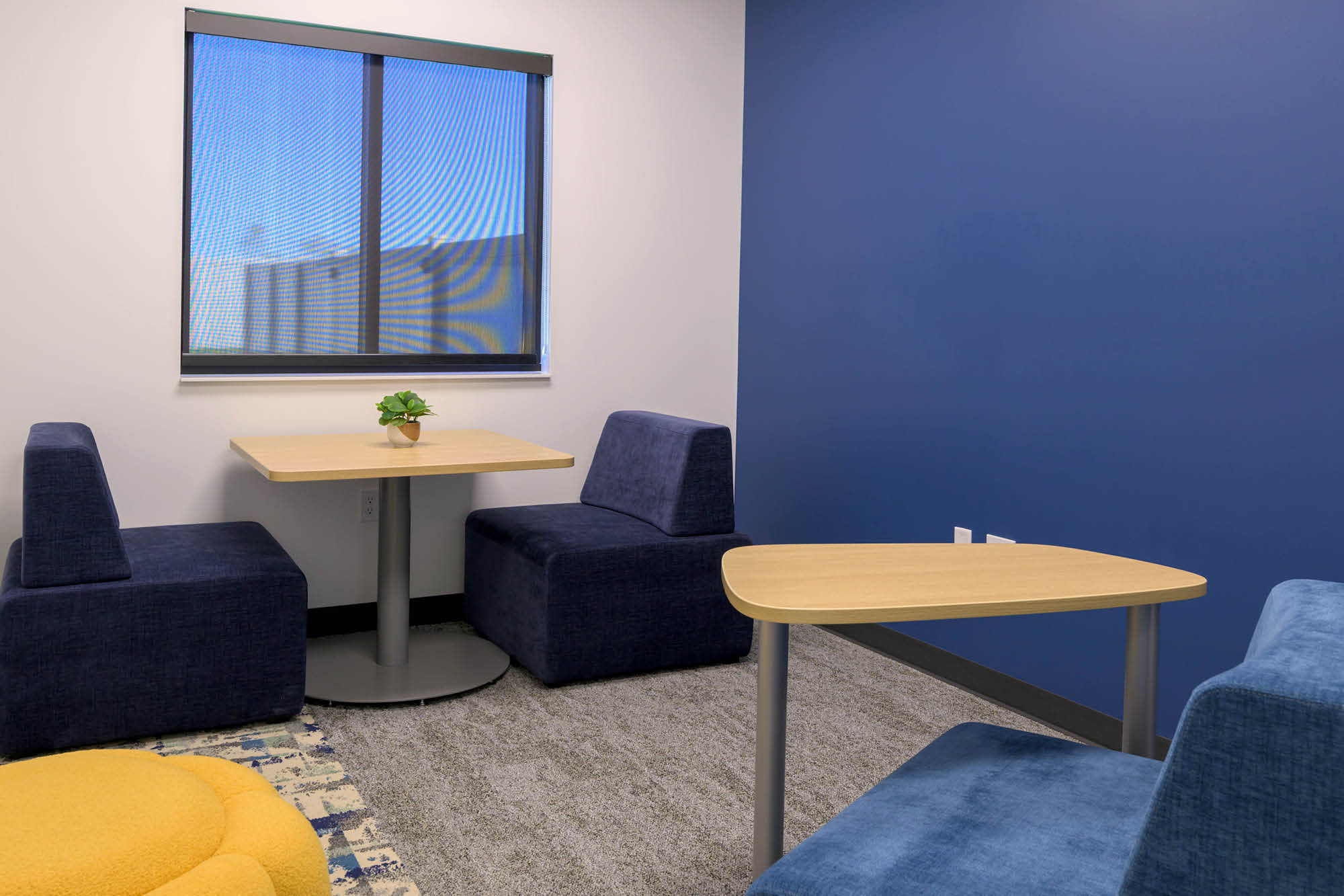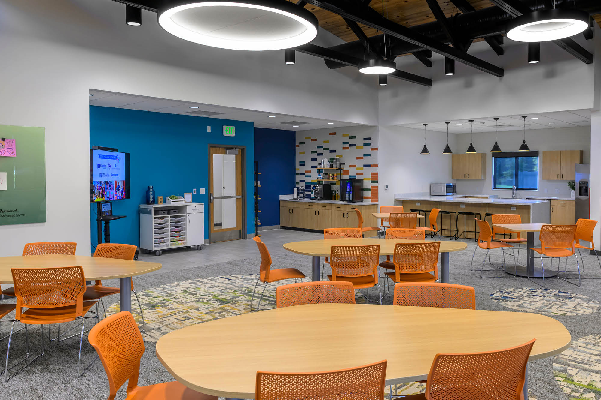 The Wing now provides a purpose-built sanctuary where older grieving youth find solace and connection. Uplifting colors, bright patterns and inviting motifs evoke hope while maintaining a cozy, coffee shop-like atmosphere. Clerestory windows emphasize dramatic ceilings and acoustic fixtures, while biophilic textures create sensory comfort. Modern black and bronze trims with bold geometric murals provide visual interest that connects with this age group.