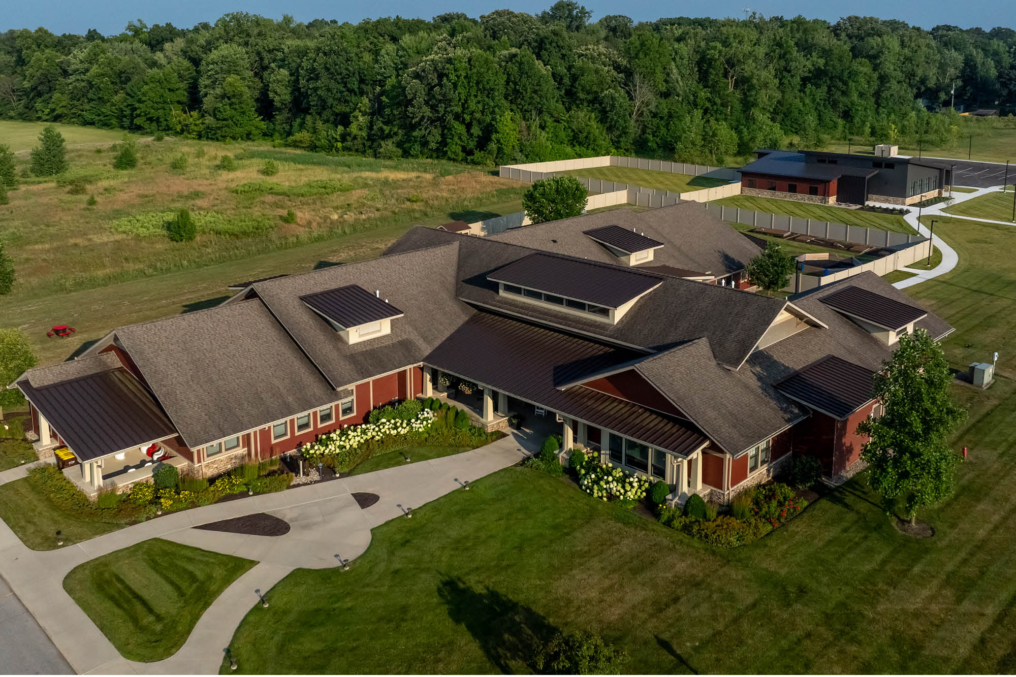 The architectural strategy centered on creating a reassuring, supportive space while feeling current and relatable. MSKTD designed the 4,500-square-foot addition to increase program space by 29%, using sustainable materials like timber and stone that blend with natural surroundings. Large windows bring natural light while offering landscape views, symbolizing openness and connection to nature—critical healing elements.